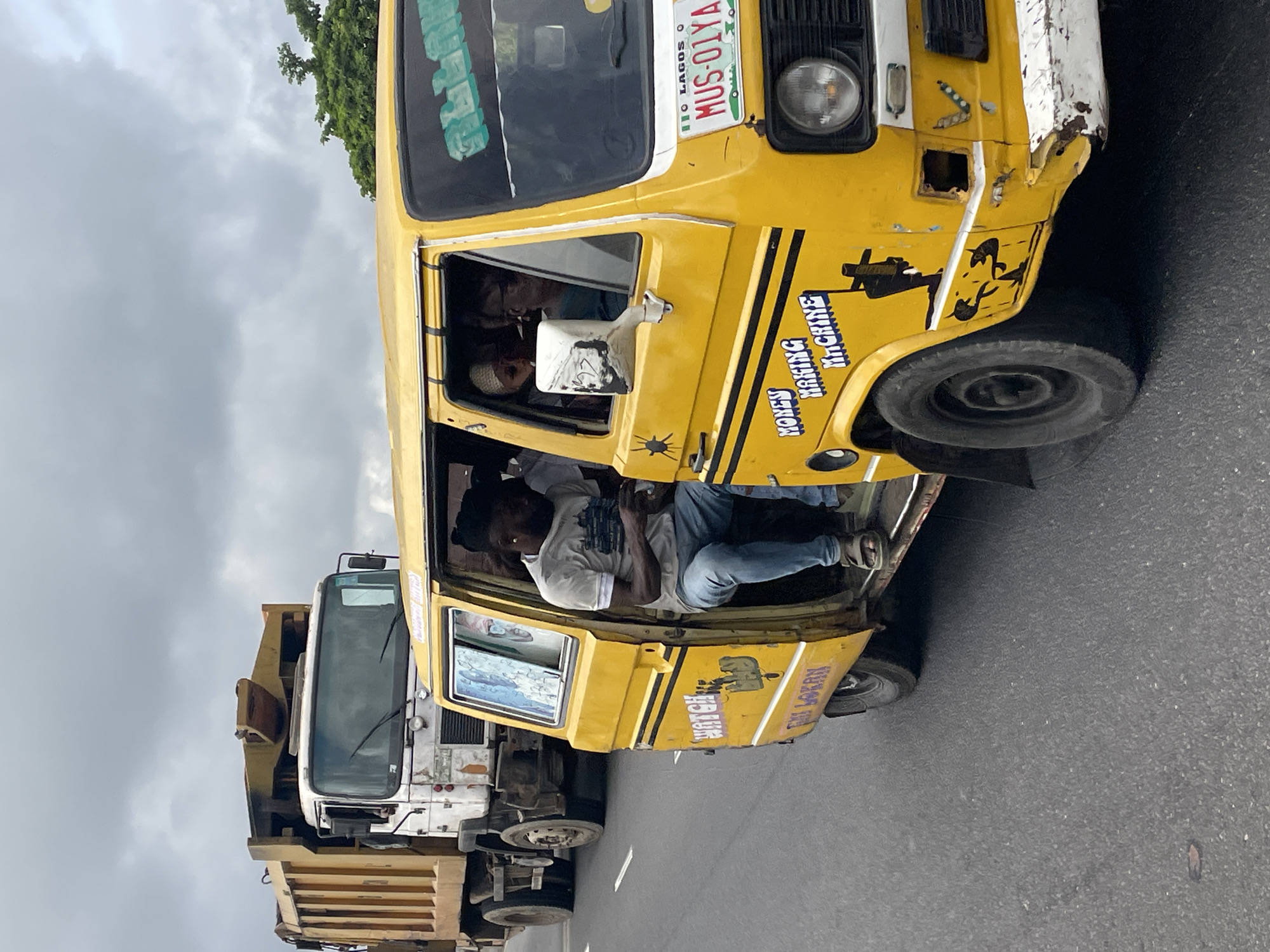 The image depicts a roadside scene in Ikeja, Lagos State, Nigeria, featuring two vehicles on a paved asphalt road under an overcast sky. In the foreground, a heavily used yellow commercial passenger van, consistent with a "danfo," travels with its large passenger-side sliding door fully open. The van displays a Lagos State license plate, "MUS-01YA," and various decals, including "WATCH," "MONEY MAKING MACHINE," and "EMI LOKAN" in blue and purple text on its side. A green "Gbana" sticker is affixed to the windshield. The van shows significant wear, dents, and paint degradation, particularly on its front white bumper which is chipped and rusted. Seated in the open doorway is a dark-skinned male with a beard, wearing a grey t-shirt, blue jeans, and brown sandals. He is looking down at a small object held in his hands, likely a mobile phone. Inside the van, other passengers are partially visible, including an individual wearing a white head covering. In the background, a large, worn white-cab dump truck with a yellow dump bed is positioned behind and to the left of the yellow van, suggesting it is in an adjacent lane or following. The road is asphalt with a visible white dashed lane marking. The sky is uniformly grey and overcast. Green tree foliage is visible in the upper right background.