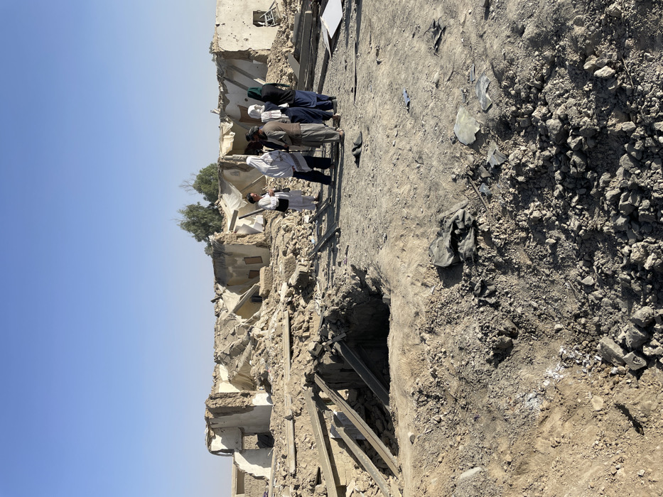 The image displays a scene of extensive structural destruction in Spin Boldak, Afghanistan, under a clear, light blue sky. In the immediate foreground, a significant, irregularly shaped crater, approximately 3 meters in diameter, is visible in the earth, revealing exposed structural elements resembling rebar and wooden beams within its excavated cavity. The ground throughout the scene is uneven, covered with a dense layer of pulverized earth, rubble, concrete fragments, and scattered debris. A crumpled dark fabric object rests on the ground to the right of the crater. In the mid-ground, a group of six individuals is positioned amidst the debris. From left to right: one individual in white traditional attire, wearing sunglasses and carrying a dark shoulder bag, faces the group. Adjacent, another individual in a white head covering holds a dark, elongated object, possibly a microphone or recording device, oriented towards the cluster. Next is a male individual dressed in a light-colored traditional outfit and a dark waistcoat. The remaining three individuals are attired in traditional garments with head coverings, two white and one dark green, clustered in close proximity. Their stance and interaction suggest conversation or observation of the site. The background is dominated by the remnants of severely damaged buildings. These structures, appearing to be single-story or multi-story constructions, have suffered significant collapse, with large sections of their roofs and upper walls missing. The remaining wall segments, constructed of light-colored material, are fragmented, displaying numerous holes and exposed internal structural elements. Piles of rubble form the base of these demolished structures. Distant, sparse green trees are visible on the horizon behind the destruction. The overall environment suggests a dry, arid climate.