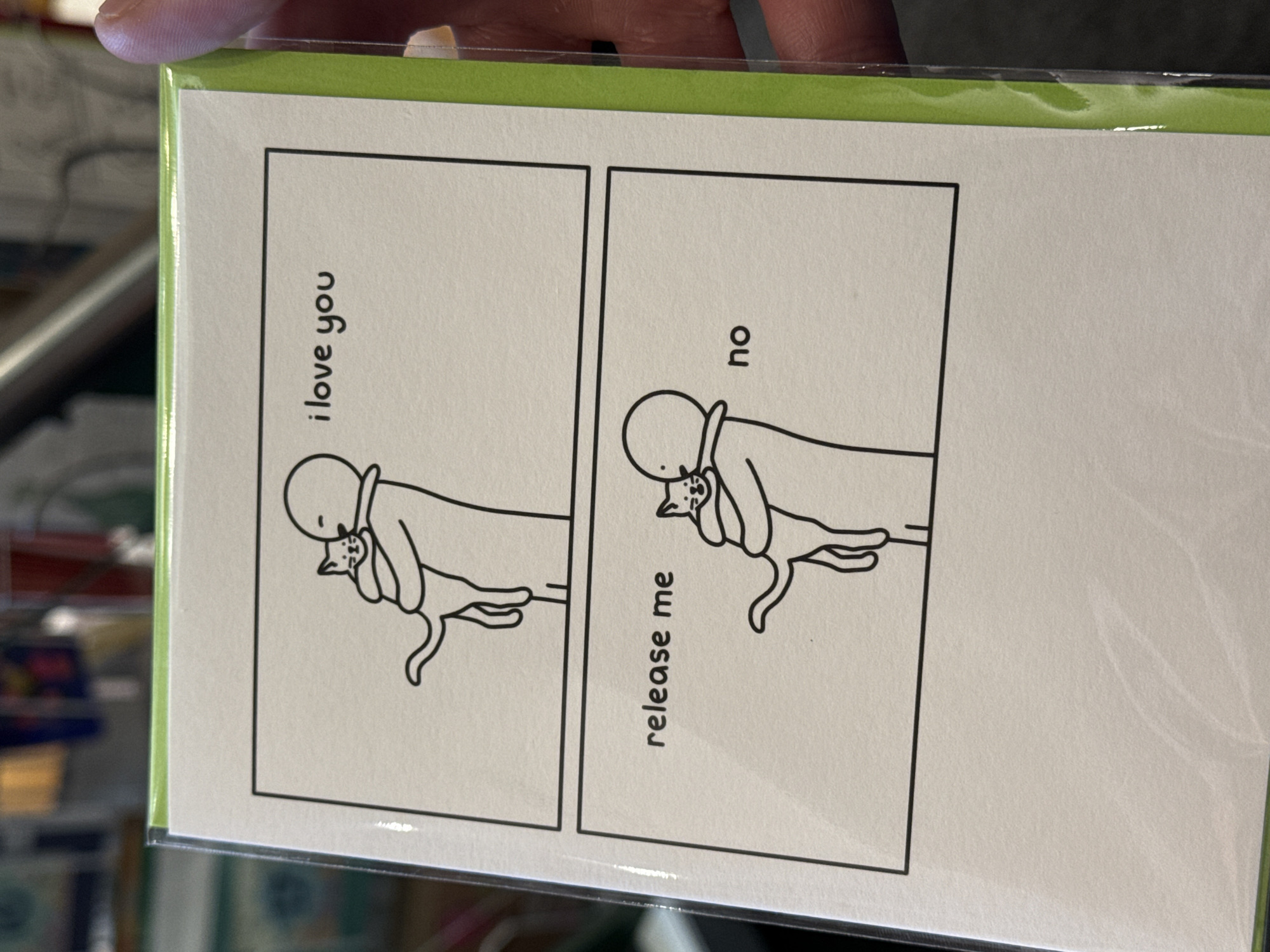 A vertically oriented greeting card, encased in a clear plastic sleeve, is presented against a blurred retail background in Ambleside, United Kingdom. The card's white front features a two-panel black-and-white comic strip. The top panel depicts a minimalist stick-figure human embracing a stylized cat, with the text "i love you" in the upper right. The bottom panel shows the same human maintaining the embrace with the cat, which has an open mouth; text to the left reads "release me", and text to the right reads "no". A bright green vertical strip is visible along the right edge of the card, beneath the plastic. A human hand, with visible thumb and index finger, grips the card's right side. The background exhibits indistinct shapes and colors, suggesting various items on display within a store.
