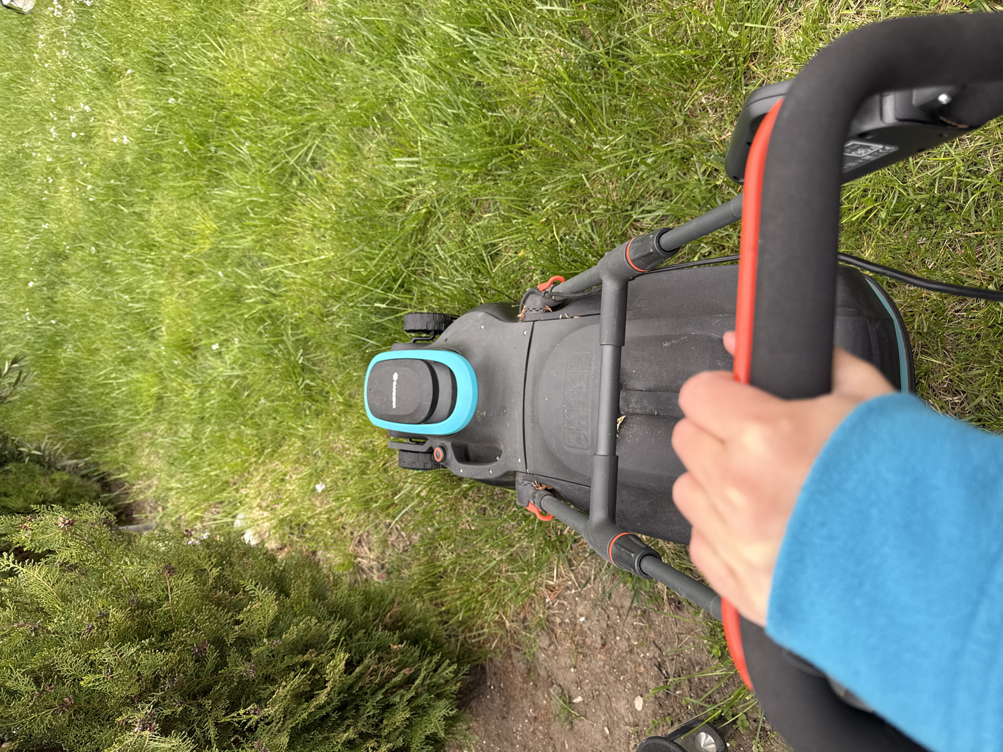 The image is taken from an elevated perspective, looking down on a person operating a lawnmower in a grassy area. The lawnmower is dark gray with a blue activation button on top and a black handle with a red safety bar. The person is holding the lawnmower handle with their hand, which is partially covered by a blue sleeve. The lawnmower is situated on a green lawn with some patches of bare earth and a dense green bush on the left side of the frame. The grass appears to be freshly cut in some areas. It is not possible to confirm the location in the city of Perushtitsa, Bulgaria from the available image.