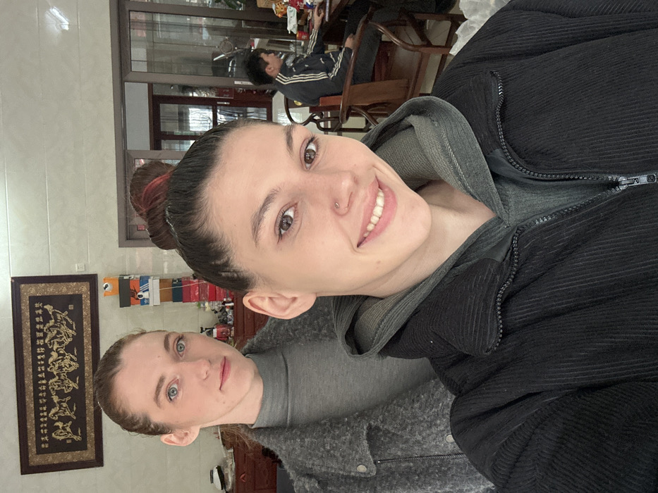 Two women pose indoors. One smiles at the camera, wearing a black jacket with a gray hoodie. Her hair is pulled back in a bun. The other woman, positioned below, has fair skin and blue eyes, wearing a gray shirt and jacket. Behind them, a framed calligraphic artwork is on the wall, and a stack of shoe boxes sits atop a cabinet. A person in a track suit is seated at a table in the background. The room is brightly lit.