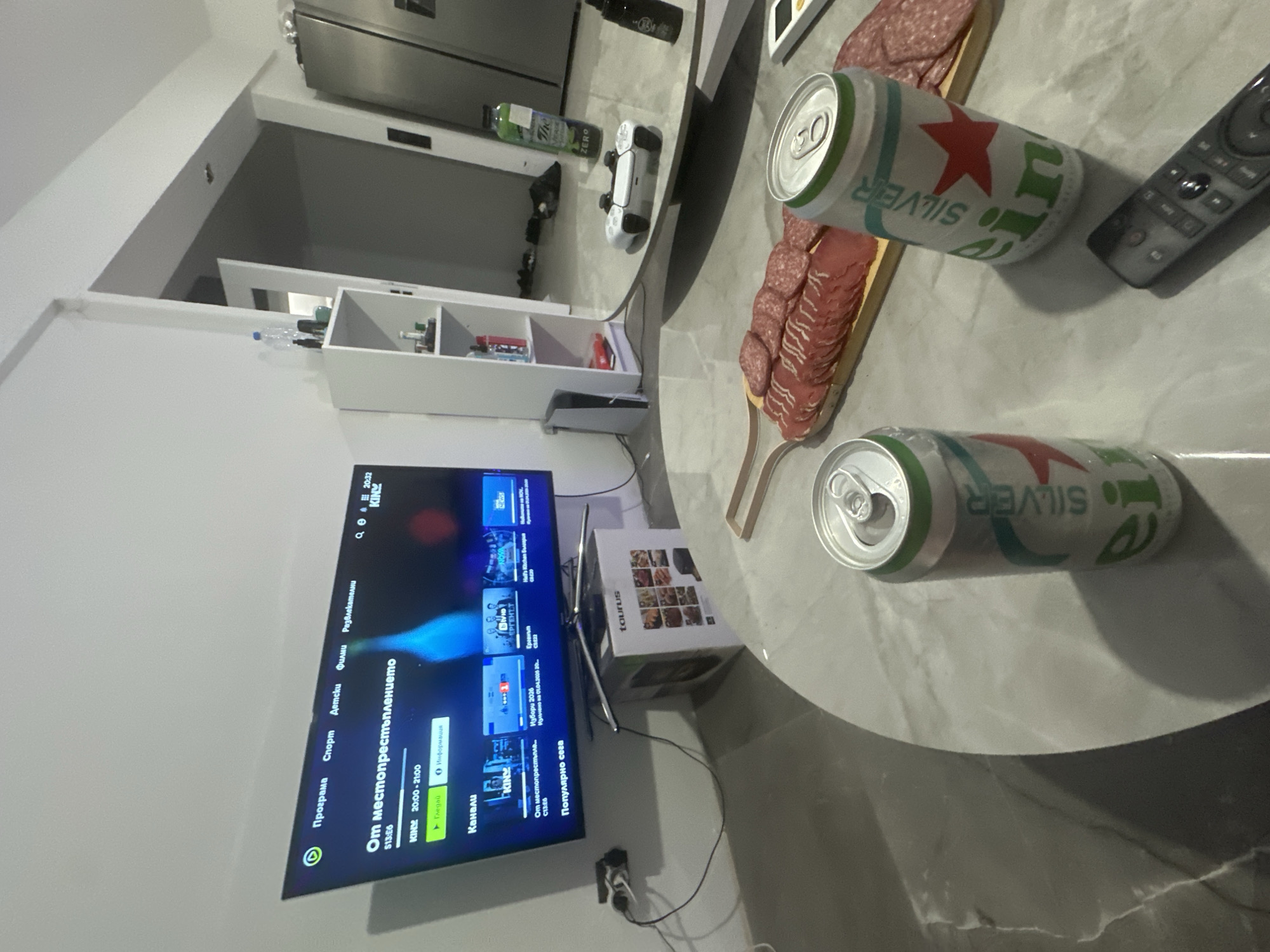 Here's a description of the image: The photograph shows an interior living space in an apartment. The scene focuses on a round, light grey marble table on which several items are placed: two cans of Heineken Silver beer, a remote control, a wooden board with slices of cured meat (salami or similar), a PlayStation 5 controller, and a product box, possibly for kitchen appliances. The foreground features a TV showing Bulgarian programming. The apartment appears modern, with a white shelving unit visible in the background. A stainless steel refrigerator is also present. An electrical outlet on the wall is visible next to the television. The presence of local TV programming suggests the location is likely in Bulgaria, and based on the programming and the brand name 'Kiny' visible on screen, the city of Sofia is a likely possibility.