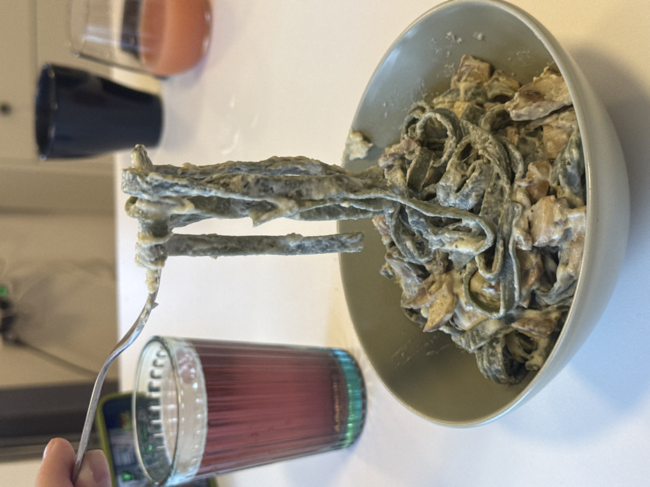 - "The scene, located indoors in the City of Zagreb, Croatia, depicts a light-skinned hand holding a silver fork, which lifts several strands of dark green, tagliatelle-like pasta from a light grey-green ceramic bowl" by FM-NjEox2, licensed under CC BY 4.0