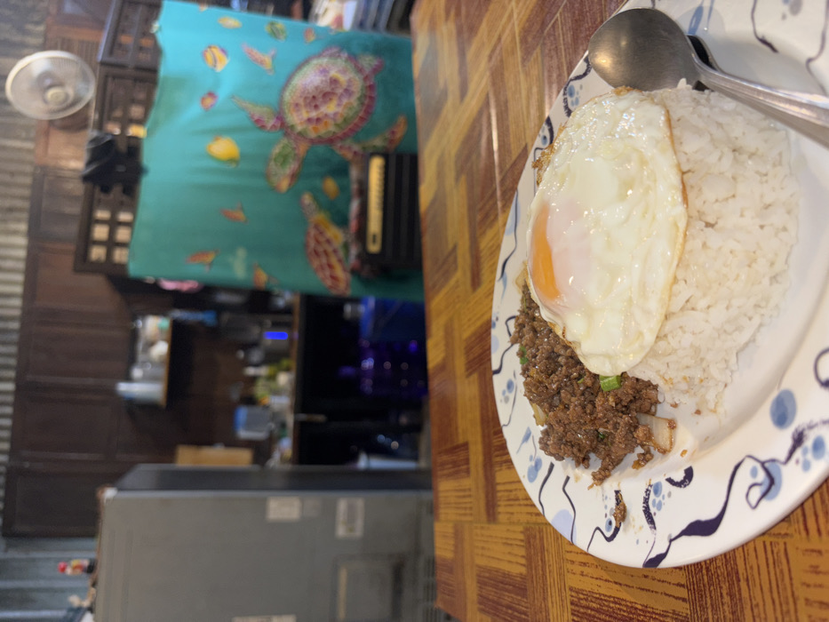 A white plate with blue and gray abstract patterns holds a prepared meal on a brown and orange tiled tabletop. The meal consists of a mound of white rice topped with a sunny-side up fried egg, yolk still runny, and a portion of dark brown minced meat containing visible green onion pieces. A silver spoon rests to the right of the plate. The background, largely out of focus, reveals an indoor setting consistent with an eatery in Ko Tao, Thailand. To the left, a silver-colored refrigerator is partially visible. In the center and right background, dark wooden cabinets and shelving units line a wall, displaying various bottles and containers on a counter surface. A prominent teal fabric tapestry or curtain, adorned with colorful sea turtle and fish designs, hangs in the mid-right background. Above the tapestry, a white wall-mounted fan is partially visible. A large purple water cooler bottle is discernible in the lower right background. No individuals are present in the scene.
