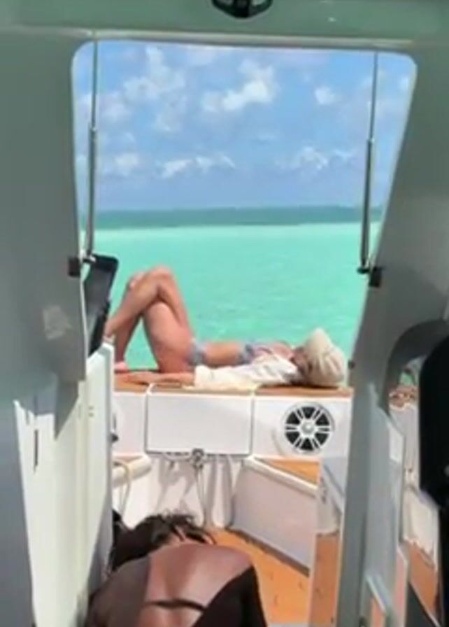 From inside a white boat, a person is seen bent over with their back to the camera. In the background, a woman is lying on her back on the deck in a bikini, a light-colored shirt and a hat. The turquoise water and a blue sky with some clouds are visible behind her. The person inside the boat is obscured from the waist down.
