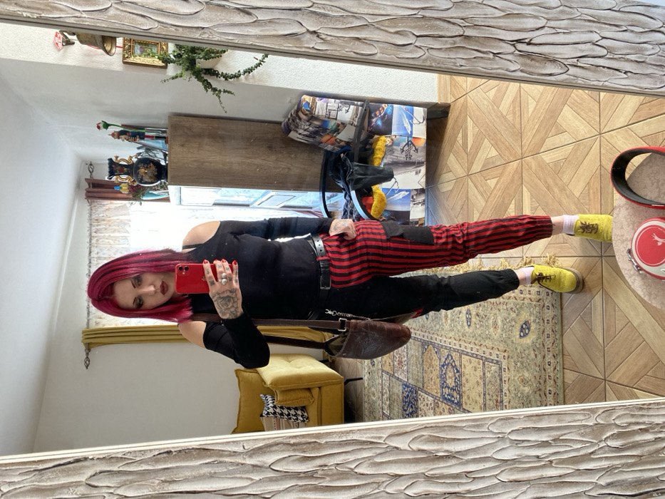An individual with magenta-colored, shoulder-length hair stands upright, centered in a full-length mirror, capturing a mirror selfie with a red smartphone held in their right hand. The subject is located indoors, within what appears to be a residential space in Kunje, Montenegro. They wear a black, long-sleeved, cold-shoulder top, a black belt, and asymmetrical pants; the left leg is solid black, while the right leg features red and black vertical stripes with a black cargo pocket. Bright yellow platform shoes with matching yellow socks are worn. A dark brown leather shoulder bag with a silver chain detail hangs from the left shoulder. Tattoos are visible on the left forearm and hand, including a rose design. Red nail polish is present on the visible fingers. The reflected environment behind the subject includes light-colored walls and a tiled floor with a light brown geometric pattern. A patterned rug with blue and yellow motifs is visible under a mustard yellow velvet sofa with throw pillows to the left of the subject. To the right, a wooden cabinet displays various decorative items, including a dark vase with gold accents, a blue vase, and a Nutcracker figurine. A green trailing plant hangs on the wall above a small framed picture and a decorative bell. Windows with light-colored curtains are visible in the far background. The mirror itself has a thick, textured, light-colored frame.
