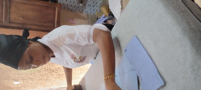 A woman wearing a headwrap and white top is ironing a blue-striped fabric on a gray surface. The fabric is shaped like a garment piece. The woman is positioned behind the ironing surface, with her right arm and a gold bracelet visible. A wooden cabinet is partially visible in the background, and the ironing surface is on top of a light-colored sofa. Other fabrics and items are blurred in the background.