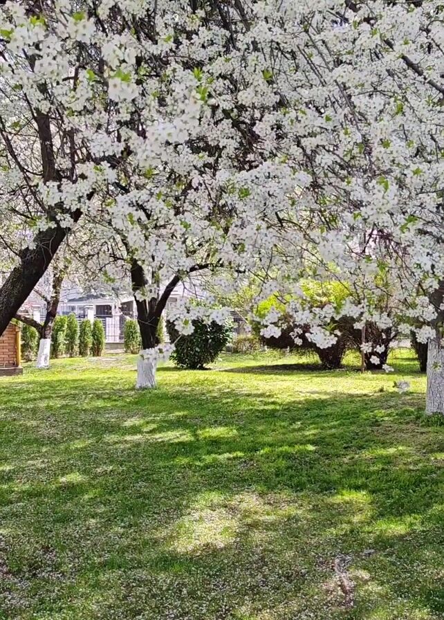 sunlit green lawn with white flowering trees. The tree trunks are painted white. There is a small wooden structure on the left side of the frame. A building with a gray roof is visible in the background. A row of small green shrubs lines the back of the yard. White flower petals are scattered on the grass.