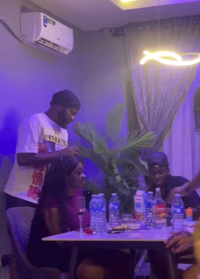 group of people seated around a table. There are four people in the foreground, and two more partially visible in the background. A man with dreadlocks is distributing what appear to be small oranges to those at the table. The table is set with water bottles, a bottle of Sierra, juice, and glassware. The room is lit with neon lights and features an air conditioner, a potted plant, and draped curtains. The atmosphere seems casual and social.