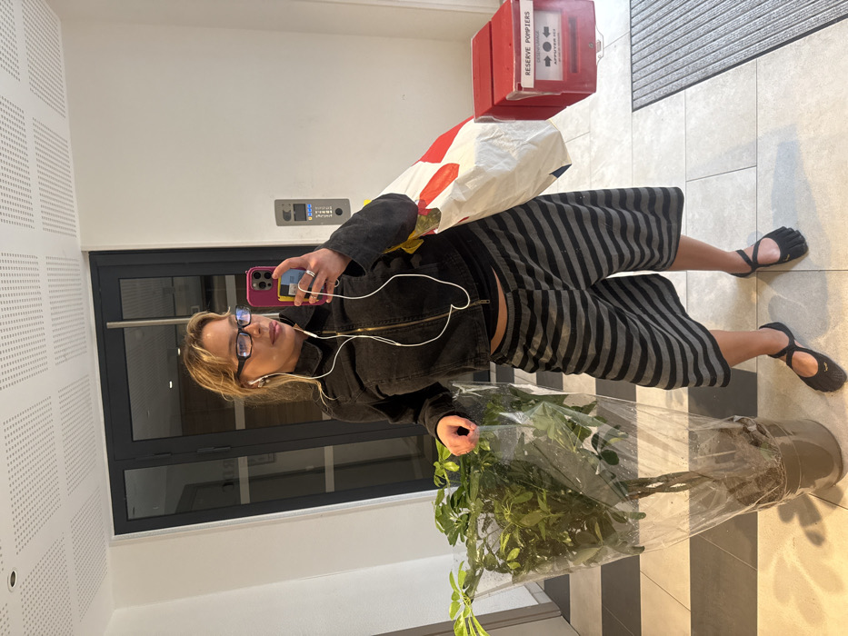 An adult female is depicted taking a mirror selfie in a well-lit indoor hallway or entryway in Nogent-sur-Marne, France