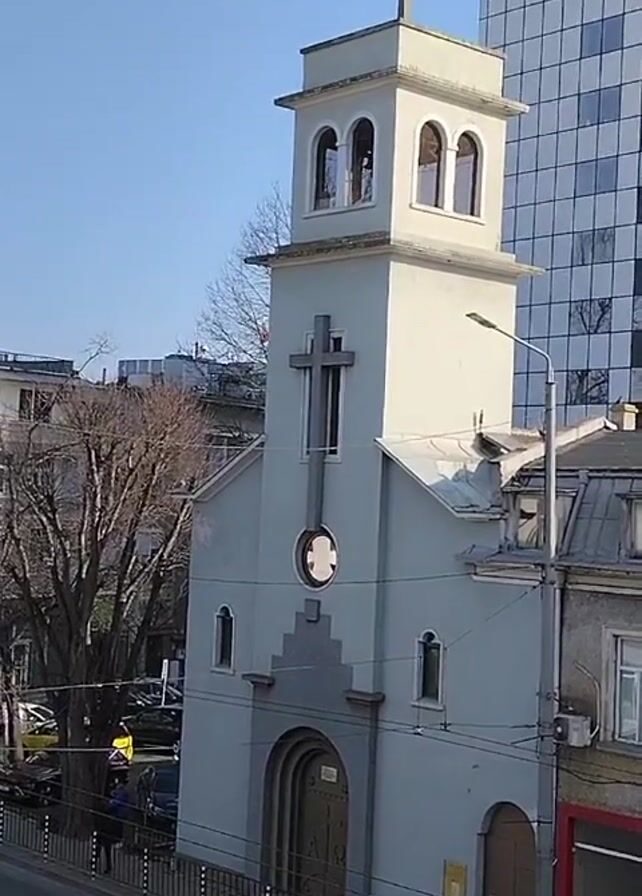 light blue, classical style church from a slightly elevated angle. The church features a tower with a cross on top and arched windows in the belfry. A cross is also visible on the front facade above the doorway. A modern office building with a glass facade rises behind the church. A street with parked cars and a few pedestrians runs in front of the church. A streetlight and other buildings are also visible. A bird flies across the sky. The sky is bright blue. The day appears sunny.