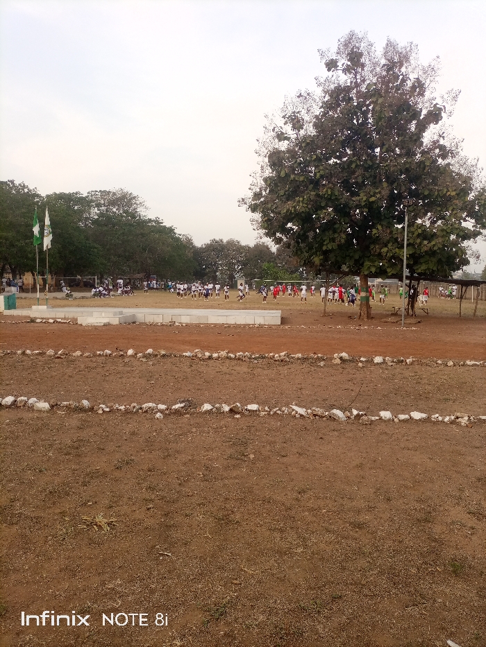 A wide shot captures a field with a sparse, brown surface, bordered by rows of white stones. In the background, a soccer game unfolds with players in white and red uniforms. A large tree dominates the right, partially obscuring the view of the game. To the left, a flag stand displays two flags. The sky is overcast, suggesting a dull day. "Infinix NOTE 8i" is visible at the bottom.