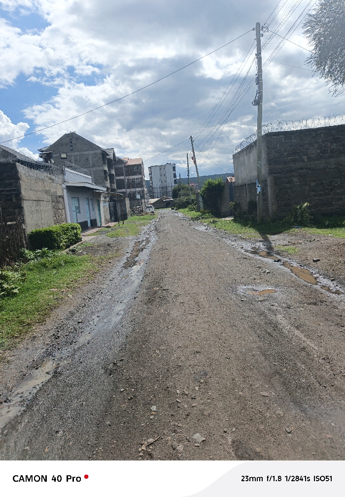 The image depicts a unpaved dirt and gravel road in Nakuru East ward, Kenya, showing evidence of recent moisture with several muddy puddles and wet patches
