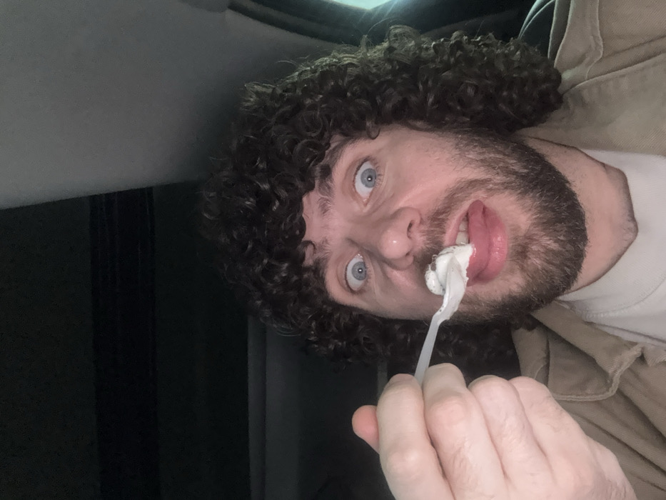 An adult male with dark curly hair and a beard is depicted in a close-up shot inside a vehicle in Pushkino, Russia. He is looking directly at the camera with wide, light blue eyes and an open mouth, with his tongue slightly extended. He holds a white plastic spoon containing a scoop of a white substance, likely ice cream with dark cookie fragments, positioned just in front of his mouth. He is wearing a light-colored t-shirt under a tan or light brown collared jacket. The background is dark and indistinct, with visible interior vehicle structures above his head, suggesting a nighttime or low-light setting.
