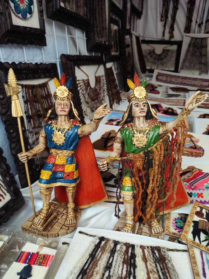 - "Two Pachacutec figurines dominate the scene, one in blue and gold with a staff, the other in green and gold adorned with multi-colored yarn" by FM-20kwN2, licensed under CC BY 4.0