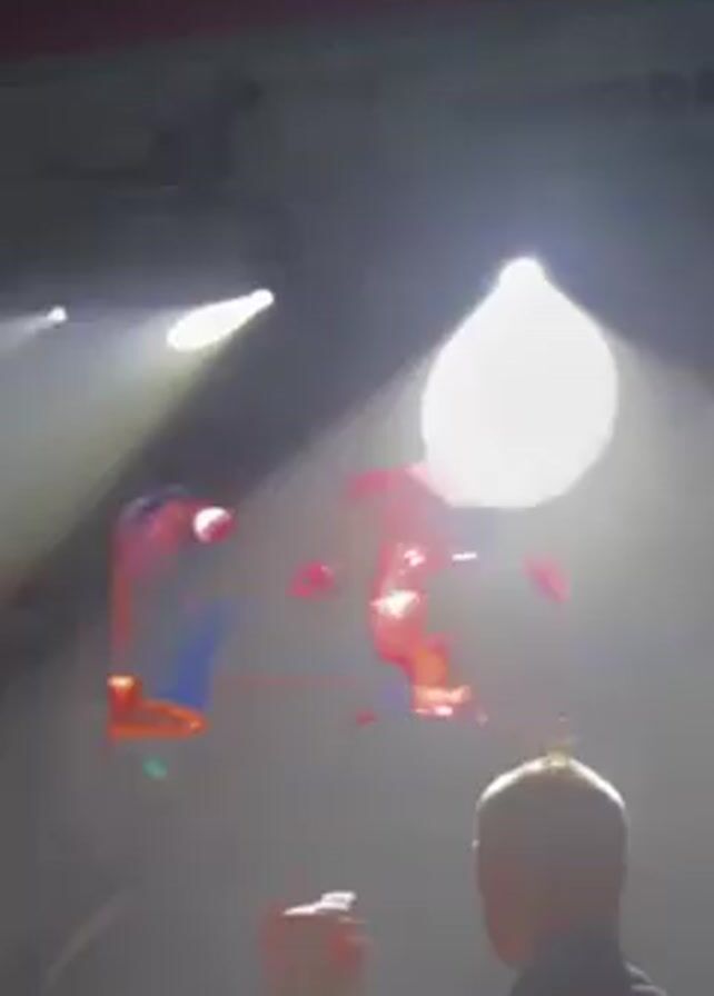 large screen in a dark indoor space, initially lit with blue stage lights
