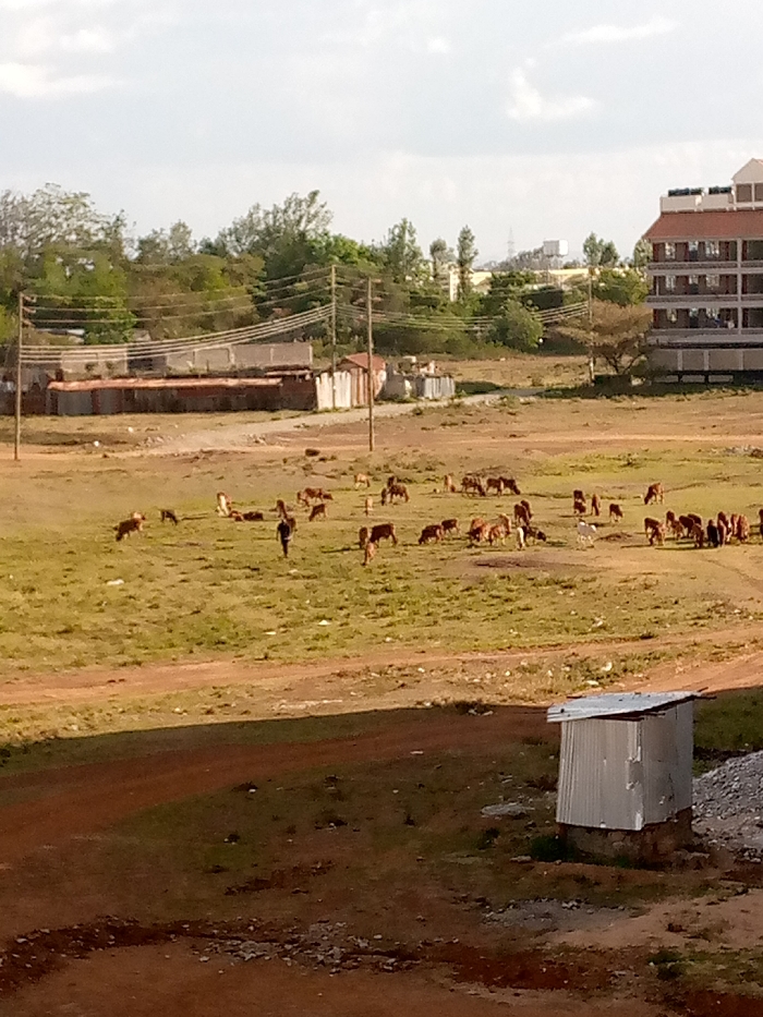 In Thika Township ward, Kenya, an open, semi-arid field is depicted under a partly cloudy sky