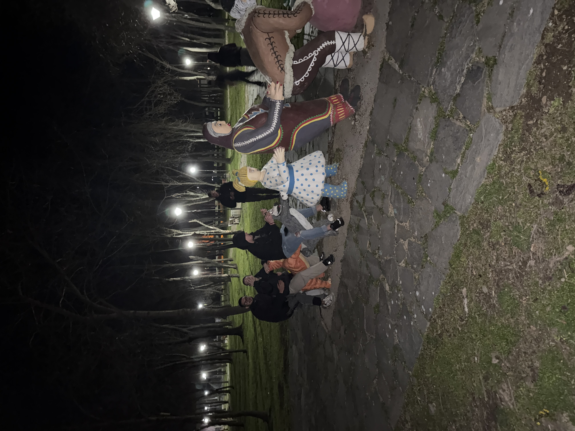 The image depicts a nighttime scene in a public park in Rakovski, Bulgaria. The central focus is a line of brightly painted folklore-themed statues arranged on a flagstone path, portraying characters engaged in a collective pulling action, characteristic of the "Repka" (Turnip) tale. From left to right, the sequence of statues begins with smaller, animal-like figures, followed by a blonde-haired child in a white and blue polka-dot dress, an older woman in traditional attire, and an older man also in traditional dress, leaning forward as if to pull. A pink, round object, likely the turnip, is partially visible at the end of the line. Four male individuals are present in the foreground and midground. Three males are actively interacting with the statues on the left side of the arrangement. One male, wearing a black top and grey pants, is seated on a small, orange-brown statue. Adjacent to him, a second male in a dark top and light pants is seated on a larger, grey-brown animal-like statue, with his left hand near his face. A third male, wearing a dark hooded top and ripped blue jeans, is seated on another animal-like statue, looking towards the right. A fourth, blurred male figure is standing further in the background, near other park elements. The environment is illuminated by numerous lampposts visible throughout the park, casting light on the scene. The ground consists of irregular grey flagstones forming a pathway, flanked by areas of short grass. Numerous deciduous trees with bare branches are scattered across the background, indicative of a late autumn or winter setting. Other blurred figures and park benches are faintly discernible in the distance.