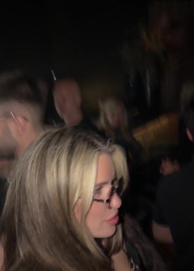 woman with blonde hair and sunglasses in a nightclub setting. She's wearing a fur coat and a leopard print top. The camera focuses on her face as she poses and moves around. Other people are seen in the background, dancing and socializing. The lighting is dim with colorful club lights. There is loud music playing.
