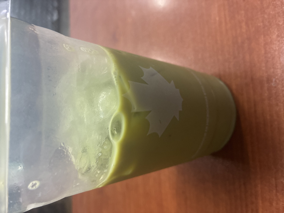 A clear plastic cup with a maple leaf logo contains a green-colored beverage, possibly a smoothie or matcha latte