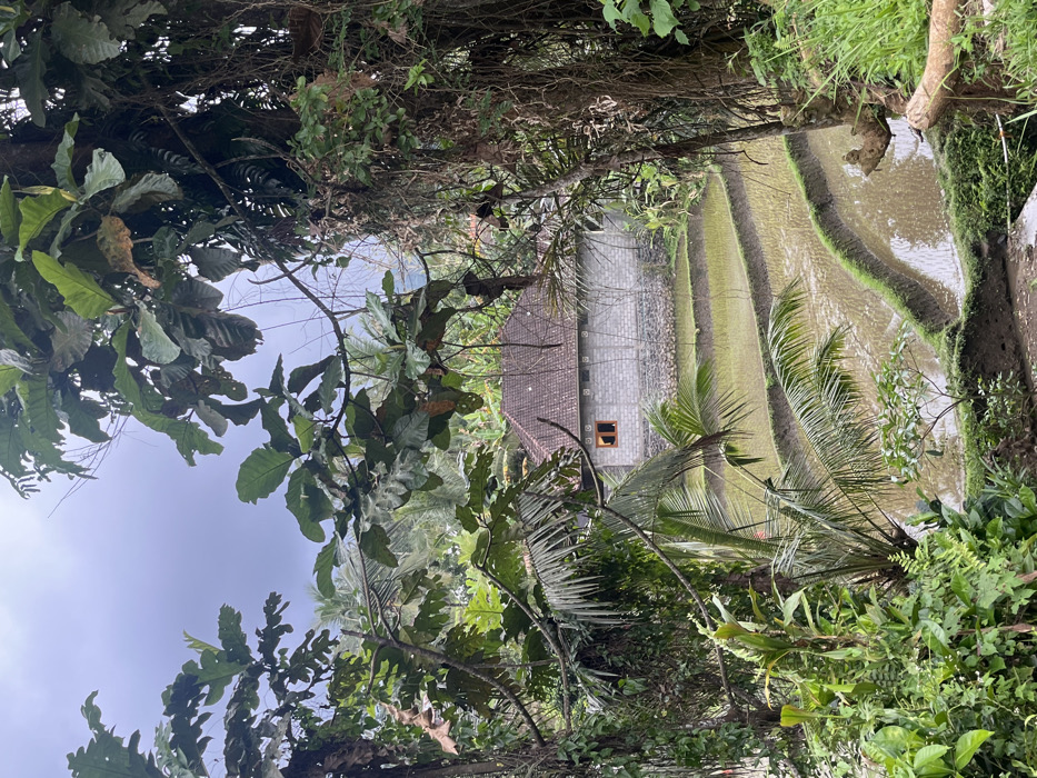 The image depicts a rural scene in Candidasa, Indonesia, observed through dense, verdant tropical foliage