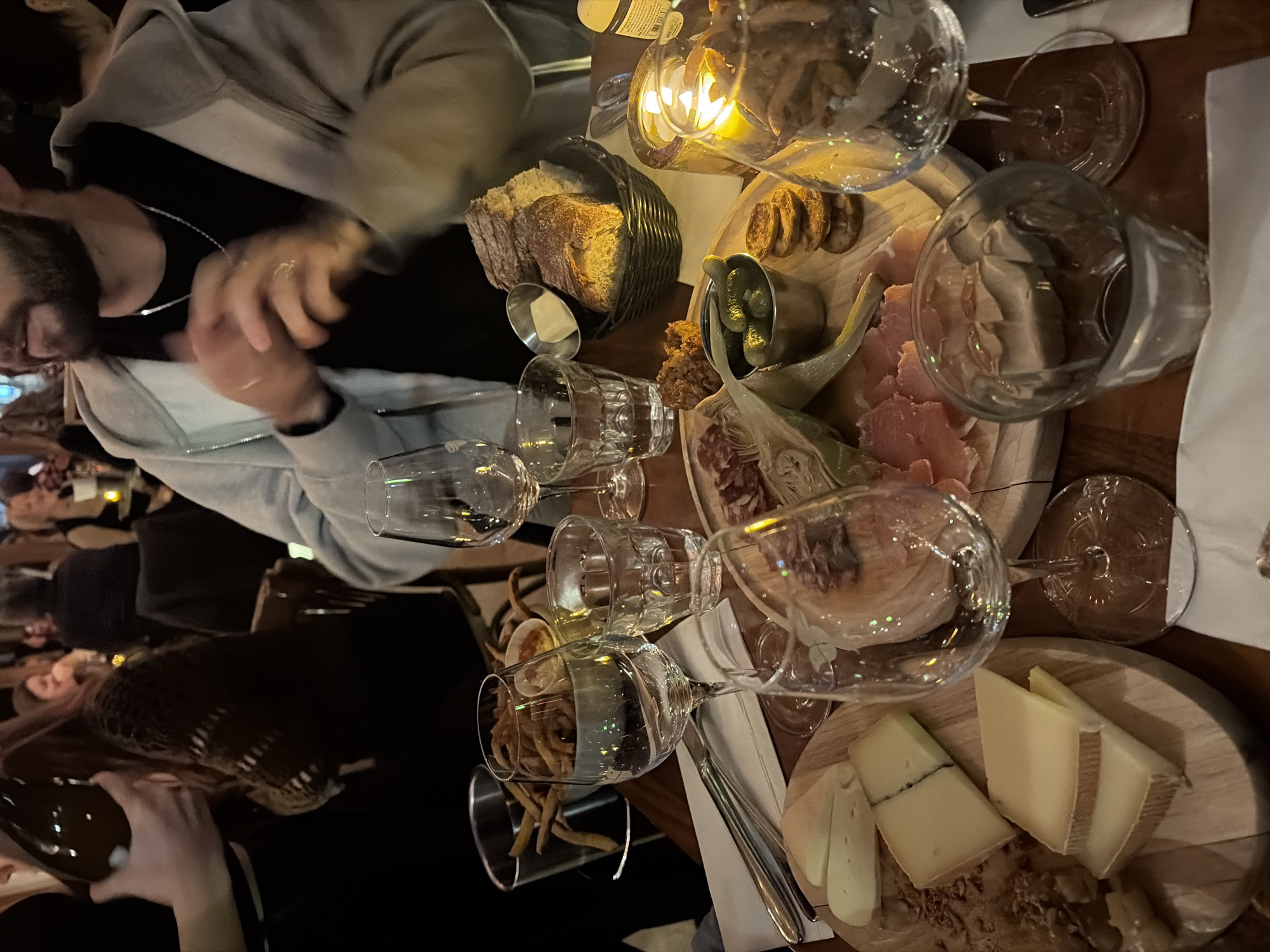 The image displays an indoor dining scene at a dimly lit establishment, likely a bistro or wine bar, consistent with venues found in Montreal, Canada. The central focus is a wooden table laden with food and drink. Two prominent wooden boards feature a cheese platter on the left with multiple wedges of various cheeses, and a charcuterie board on the right displaying thinly sliced cured meats (e.g., prosciutto, salami), sliced artichoke hearts, pickled gherkins in a small metal cup, and crackers. Additional food items include a metal bucket filled with fried onions or thin-cut fries alongside a white dip, and a woven basket containing sliced bread accompanied by a pat of butter in a small dish. Numerous glasses are present: several stemmed wine glasses (some empty, some containing liquid) and smaller tumbler glasses. A lit candle in a glass holder provides ambient illumination. Two individuals are partially visible in the foreground. On the right, a person with a beard is wearing a grey hooded sweatshirt over a black t-shirt and a silver chain; their hands are blurred due to motion. On the left, a person's hand is holding a dark bottle, possibly wine. Multiple other patrons are visible in the blurred background, suggesting a busy dining environment. The overall ambiance is warm and social.