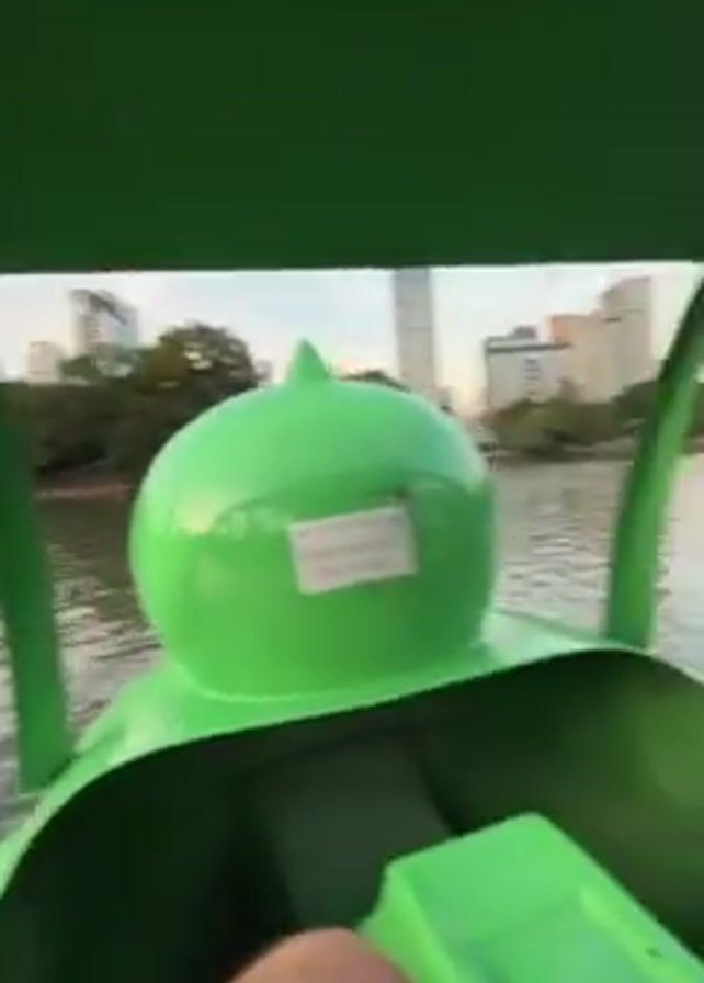woman in a green life vest seated in a green paddle boat on a lake. She turns to face the camera and smiles and waves. There are other paddle boats on the water. In the background are tall buildings and trees. The sky is blue with white clouds.