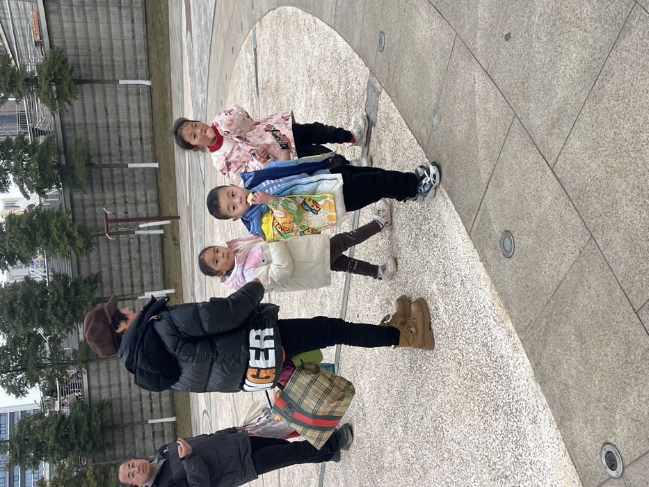 The image depicts an outdoor public space, identified as being in the city of Banan, China. The ground consists of a light grey speckled aggregate surface meeting a darker grey tiled pathway in a curved line, with circular in-ground lights embedded in the tiled section. In the background, a concrete retaining wall supports a row of slender trees with white-painted lower trunks. Distant buildings are partially visible above the trees. Five individuals of East Asian descent are present. From left to right: 1. An adult male, wearing a dark jacket and pants, holds a light-colored bag in his left hand. He is partially obscured and looking to his right. 2. An adult female, positioned centrally, wears a brown cap, a black puffer jacket with "NGER" in white text on the lower back, black pants, and tan work-style boots. She carries a plaid tote bag with red and green stripes on her left arm and another light-colored bag on her right side. She is turned away from the camera, facing slightly right. 3. A young female child stands to the immediate right of the adult female. She wears a light pink and white puffer jacket, dark pants, and white sneakers, looking towards the camera. 4. A young male child stands in the foreground, wearing a blue jacket over a colorful patterned top, dark pants, and multi-colored sneakers. He holds and eats a light-colored fruit in his right hand. A colorful bag with cartoon characters hangs around his neck. He faces the camera. 5. A young female child stands to the right, wearing a pink patterned jacket, dark pants, and white sneakers. She holds a dark-colored object in her right hand and has her left hand near her mouth. She faces slightly towards the left of the frame. All individuals appear to be standing or moving slowly in the paved area. The sky is overcast.