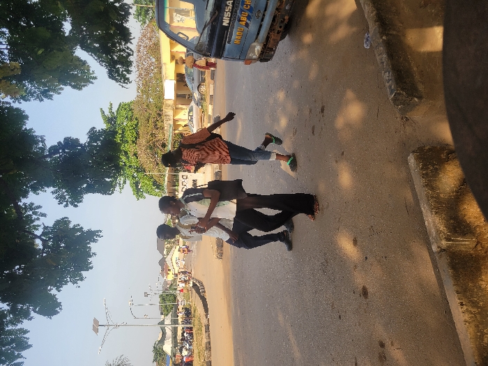 The image depicts a street scene in San Martín, Colombia, under clear daylight conditions with visible shadows. Three individuals are walking from left to right across an asphalt road in the mid-ground. The leftmost subject is a male wearing a white t-shirt, dark trousers, and dark shoes, carrying a backpack. The middle subject is a female in a white and dark short-sleeved top, dark wide-leg trousers, and sandals, carrying a dark shoulder bag and holding a light-colored item. The rightmost subject is a female in an orange/brown patterned long-sleeved top, blue jeans, and light green sandals, also with a shoulder bag. On the far right, a light blue Nissan van, displaying "NISSAN" and "MADU ABU CH" on its front, is partially visible, showing signs of rust on its bumper. In the immediate foreground, a concrete curb with white residue is present. The background features multiple solar-powered streetlights with rectangular panels, low-rise buildings, and extensive green foliage from trees. A gathering under a canopy with several other individuals is visible in the far-left background. Additional vehicles are present on the road in the distance. The overall environment suggests an urban or semi-urban area.