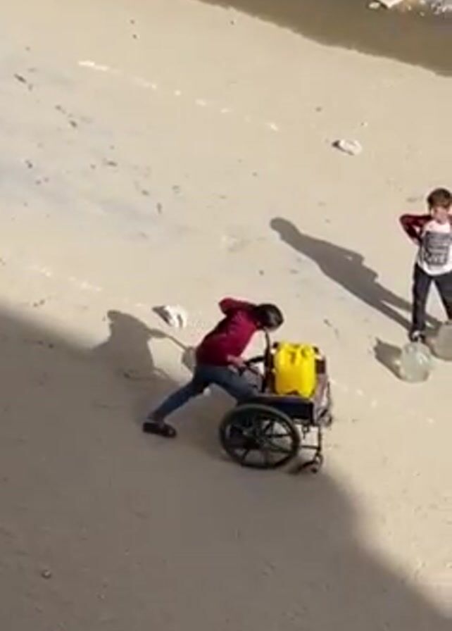 From an elevated angle, a woman in jeans and a dark red top strains to push a wheelchair loaded with a yellow container over a dirt road. A boy with two similar containers stands to the side with his hands on his hips. A young man in a light top and dark pants walks by. The setting is arid, with a concrete ditch on one side of the road and partial building shadows cast across the scene.