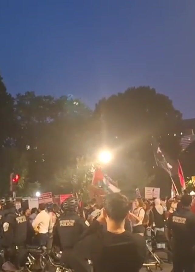 large crowd of people gathered on a street at night. Many are holding signs and flags. There is a line of police officers, some on bicycles, facing the crowd. The sky is a dark blue, and there are streetlights illuminating the scene. Some buildings and trees are visible in the background.