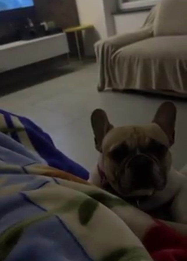 tan-colored French Bulldog lying on a person's lap, covered by a patterned blanket. The dog wears a pink collar and appears to be looking directly at the camera. In the background is a living room setting with a television on a white stand, a small yellow table, and a light-colored couch draped with a cover. The room is lit with ambient lighting, giving it a dim atmosphere. The dog vocalizes with a low whine.