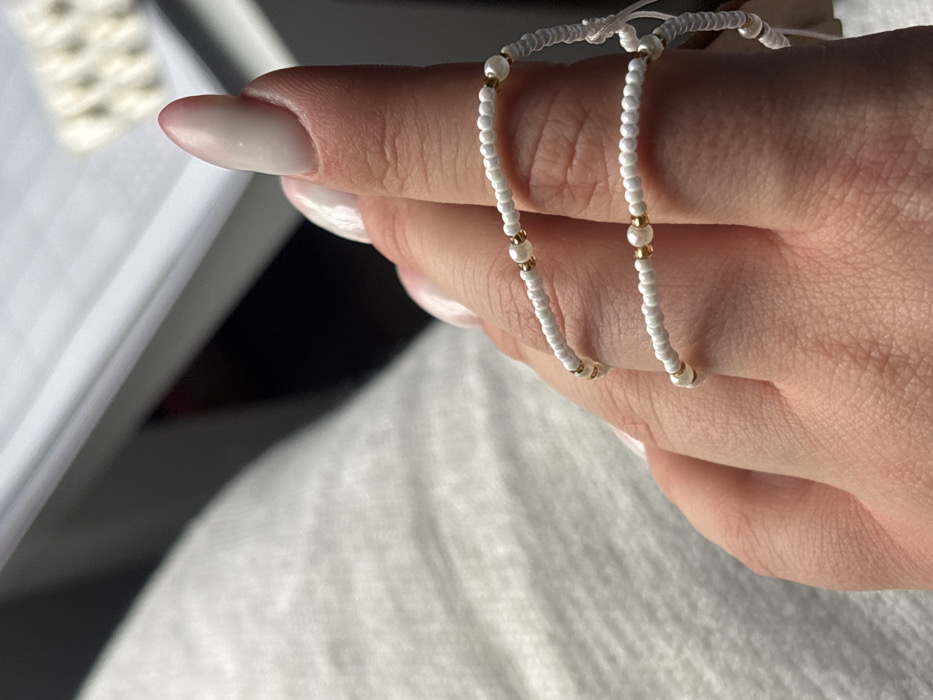 A close-up photograph displays a human hand, specifically the index and a portion of the middle finger, positioned vertically in the frame. The hand has fair skin with long, almond-shaped fingernails featuring a French ombre manicure, characterized by white tips blending into a natural pinkish base. Two strands of white beaded jewelry are wrapped around the index finger. Each strand is composed primarily of small, opaque white beads interspersed with smaller, spherical gold-colored metallic beads. A thin white string or cord, likely part of the jewelry's adjustable fastening, is visible to the right. The background is out of focus, revealing a light-colored, textured fabric to the left, possibly clothing. To the upper right, a white surface resembling paper or a document with faint lines is visible, alongside a small, light-colored, patterned object. A distinct dark shadow is cast behind the hand, indicating a strong, focused light source. The scene is situated indoors, likely at a desk or table, in the city of Leeuwarden, Netherlands.
