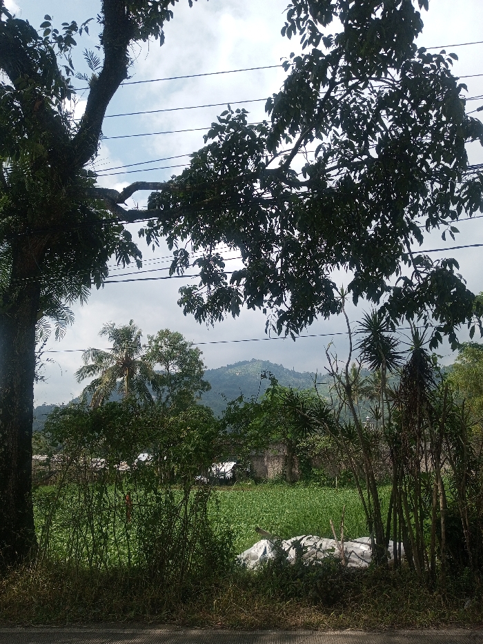 The image depicts an outdoor, semi-rural landscape in Cibodas, Indonesia. The scene is dominated by dense vegetation under a partially cloudy sky with visible utility lines. In the immediate foreground, a dark, paved surface transitions to a strip of dry, light-colored grass and foliage. A large, dark-barked tree trunk, adorned with epiphytic growth, occupies the left side, its leafy branches extending into the upper frame and silhouetted against the sky. Multiple dark electrical or communication wires traverse horizontally across the upper portion of the image, passing through the tree canopy. The midground features an expansive field of vibrant green crops or plants. Beyond this field, various structures are discernible: a white-roofed building is partially visible to the left, and a weathered stone or concrete wall/building is present on the right, both largely obscured by trees. Several trees are scattered throughout the midground, including a prominent palm tree with a curved trunk. In the lower-right mid-ground, a pile of white sacks or tarpaulins is situated amongst the foliage. The background showcases a range of verdant, tree-covered mountains or hills against a sky that is a mix of light grey and white. No human figures or specific actions are visible within the frame.