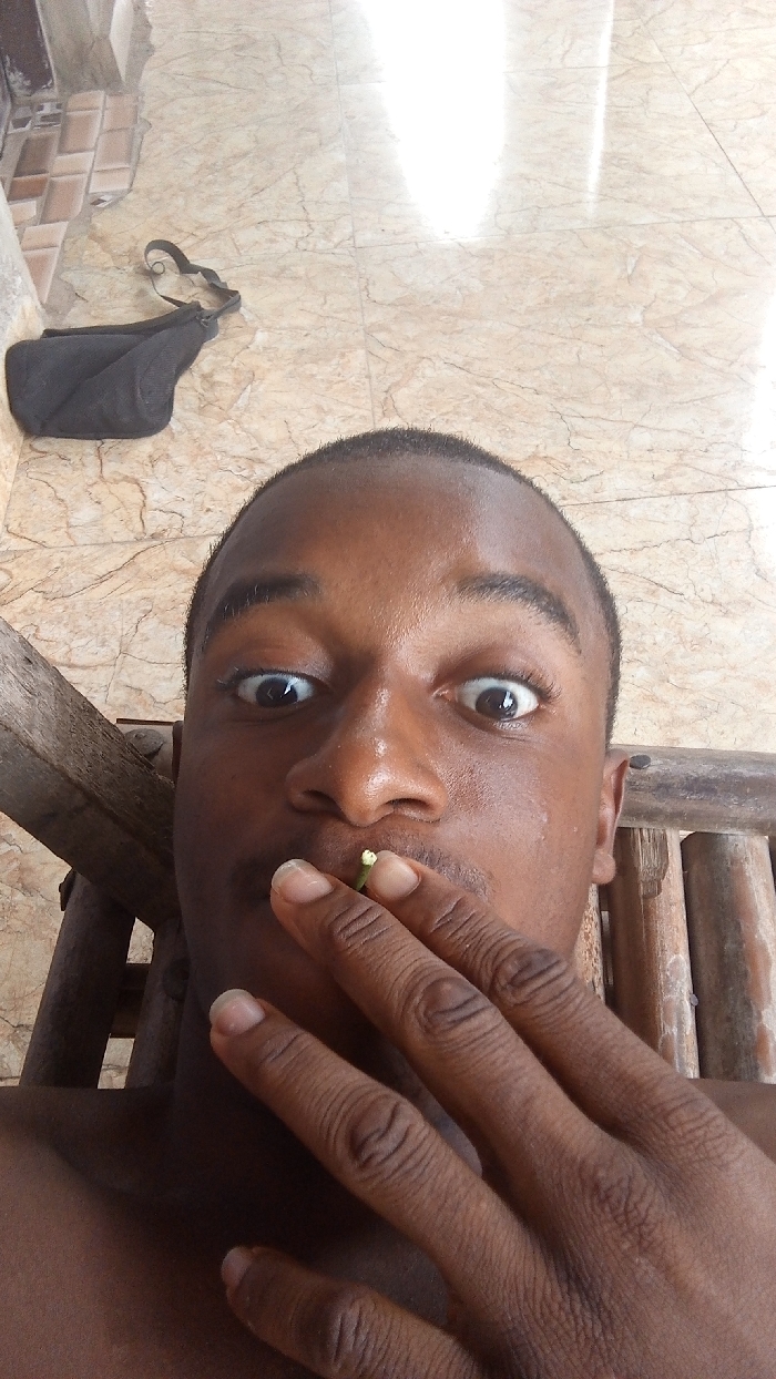 A man's close-up face is positioned almost vertically, gazing at the camera with wide, startled eyes. He holds a small green item between his lips and fingers, obscuring the lower half of his face. The man has dark skin, short hair, and a light mustache. He appears to be sitting in a wooden chair. A black bag rests on a tiled floor in the background. The lighting is bright and natural.