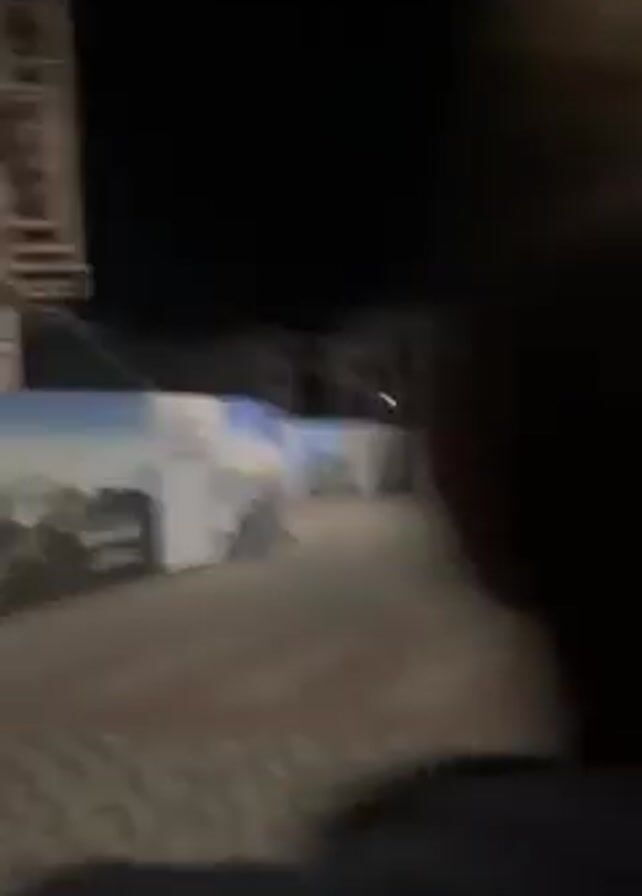 At night, a child on a tricycle with glowing multicolored lights rides on a brick road next to a building under construction