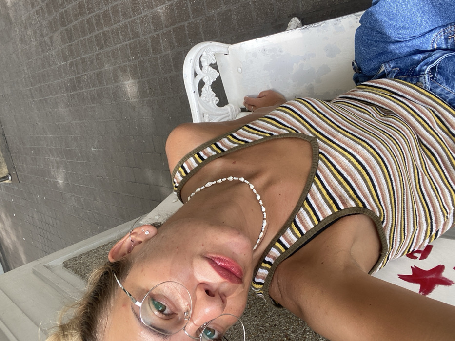 A self-portrait captured in Pattaya City, Thailand, features an adult female seated outdoors on a weathered white public bench. The bench exhibits chipped white paint, decorative cast-iron supports, and a distinct red star motif painted on its backrest. The female subject has light-colored hair styled in an updo and wears clear-framed circular eyeglasses with green-tinted lenses. Visible piercings include a small hoop in the left nostril, and a stud, helix hoop, and an additional upper helix piercing on the left ear. She is wearing red lipstick. Her attire consists of a striped tank top with olive green, white, light brown, and yellow-gold horizontal stripes, trimmed in olive green, paired with blue denim jeans. A necklace composed of irregularly shaped white beads or pearls is worn, along with a silver-colored ring on the ring finger of her left hand. The immediate environment includes a dark grey paved surface, likely interlocking pavers, visible to the right and behind the bench, and a light-colored wall or building facade to the left. The scene is illuminated by natural daylight.