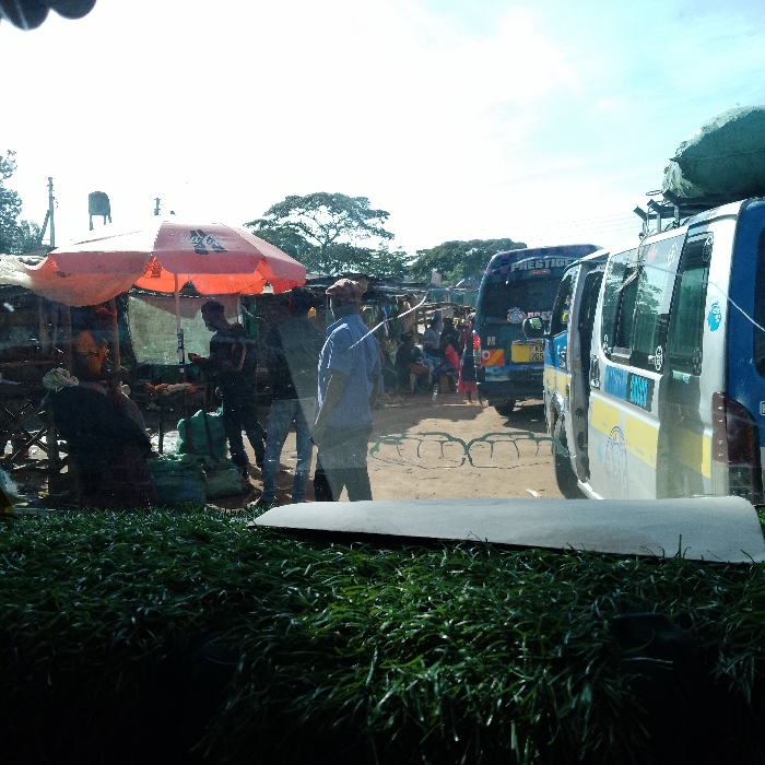 The image depicts an active open-air market and transport hub in Mukuyuni, Kenya, captured from the interior of a vehicle