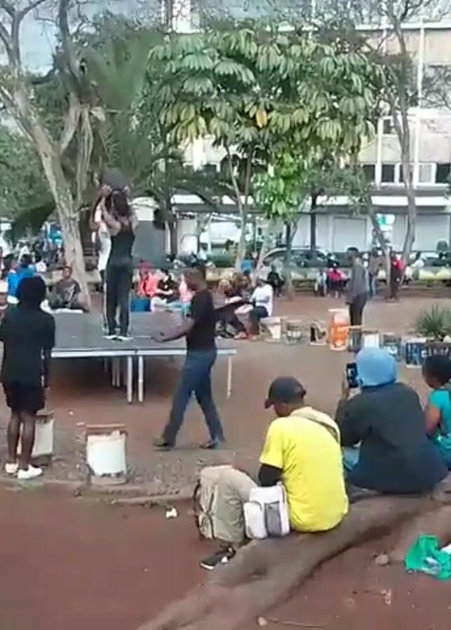 A public park scene shows a large group of people gathered around a low platform stage. On the stage, two individuals are performing an acrobatic routine, one balancing the other in a handstand position. Surrounding the stage are onlookers, some seated on the ground or on buckets. The people are dressed in casual clothing. Many are holding or playing drums. A large tree dominates the right side of the frame, and buildings are visible in the background. The atmosphere appears lively, with music and movement. The ground is mostly dirt with patches of grass.