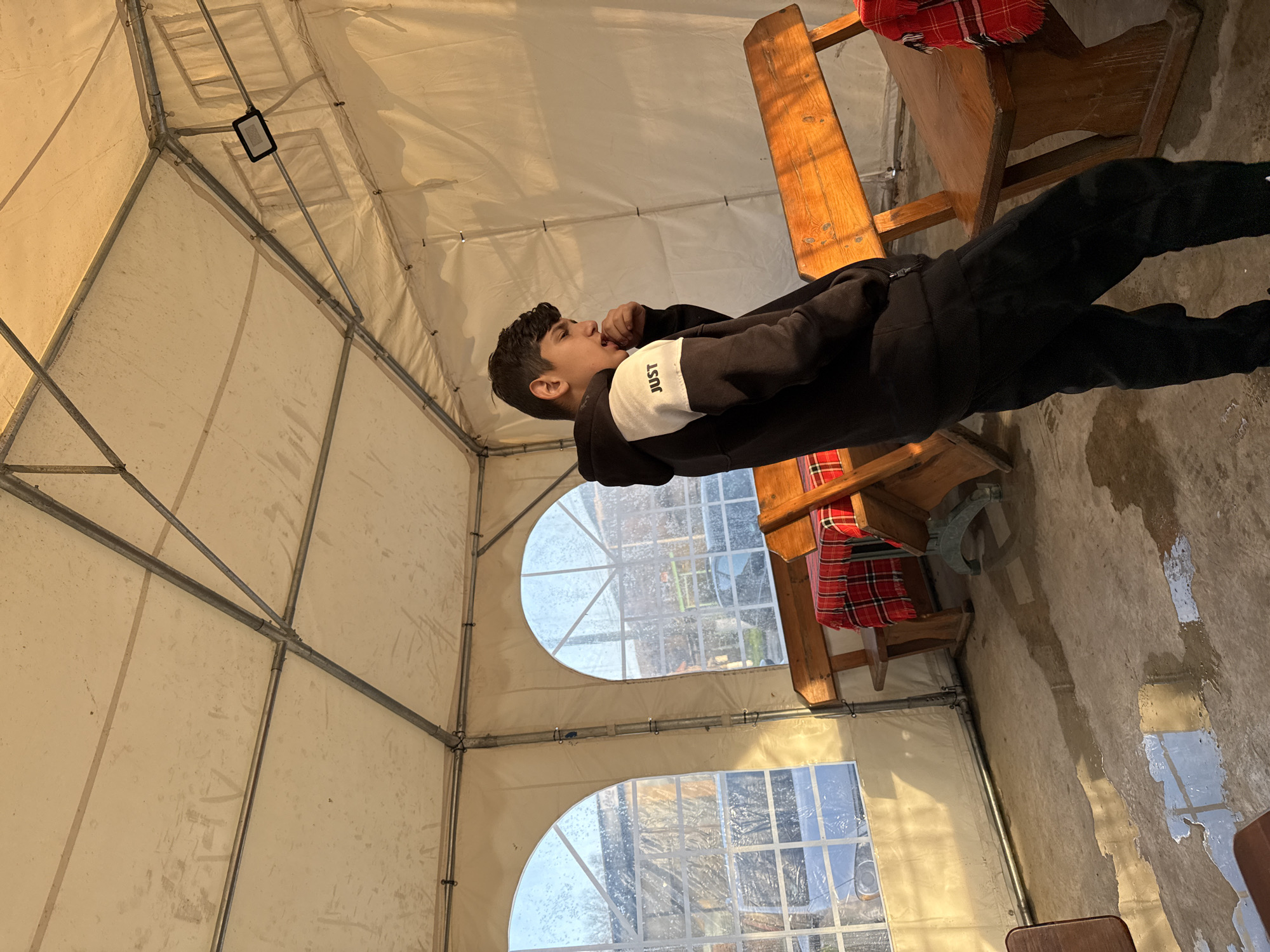 A teenage boy in a black sweatshirt with "JUST" on the sleeve is standing inside a white tent with arched windows. He has his hand near his mouth. A wooden picnic table with a red plaid cushion is visible on the right. The tent appears to be located outdoors, with a view of a wet or icy surface and possibly vehicles visible through the windows. The location is Zlatna Panega, Bulgaria.