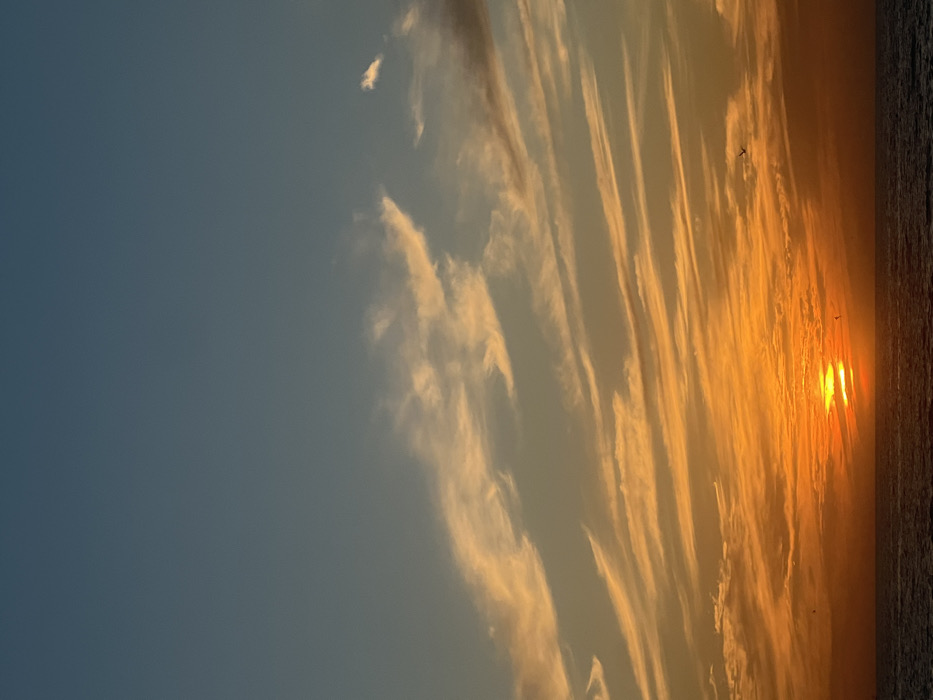 A mesmerizing sunset dominates the scene. The horizon blazes with radiant orange hues as the sun dips toward the ocean, its light reflecting off the water's edge. Wispy, elongated clouds streak across the sky, illuminated with golden light. A calm blue sky fills the upper left portion of the image. A few dark, indistinct shapes are visible, possibly birds in flight. The overall impression is one of tranquility and natural beauty.