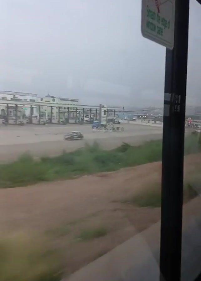 Okay, here is a concise description of the video: The video is taken from inside a bus, looking out the window as it drives past a building on a hazy day. The building appears to be a series of white and green structures, possibly toll booths or a service area of some kind. Between the bus and the building is a patch of dirt and some green vegetation. The bus's interior is visible, including an "Emergency Exit" sign and seats with colorful fabric. The camera moves slightly, providing a view of the bus's interior.