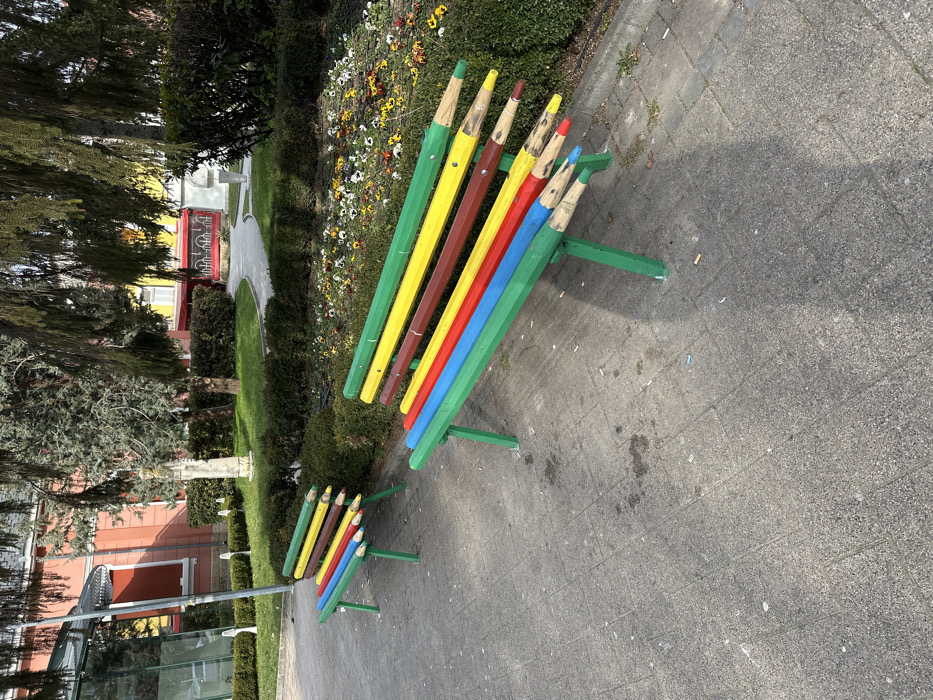 - "The scene depicts an outdoor public area in Razgrad, Bulgaria, featuring two brightly colored park benches designed to resemble oversized pencils" by FM-7nxE93, licensed under CC BY 4.0