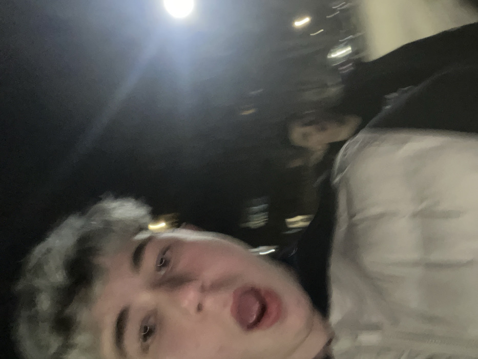 The image depicts an outdoor, nighttime scene in the city of Botevgrad, Bulgaria, specific street location undiscernible. Two individuals are present, captured with shallow depth of field. The primary subject, positioned in the foreground and occupying the left half of the frame, is a young individual with light-colored, possibly bleached or dyed, short hair. The face is fair-skinned with light-colored eyes. A piercing is visible above the left eyebrow (viewer's left). The mouth is wide open, revealing the tongue. The individual is wearing a light-colored, possibly white or light grey, puffer-style vest or jacket over a dark garment. This individual is looking directly towards the camera. The secondary subject is visible in the background, to the right of the primary subject. This individual is significantly blurred and appears to be standing further back. The face is indistinct, but seems to be looking forward. Dark clothing is apparent. The environment is dark, indicative of nighttime. A bright, circular light source, consistent with a streetlamp, is prominent in the upper right quadrant, casting significant illumination and creating a lens flare effect. Other fainter, blurred lights are discernible in the deeper background, suggesting additional streetlights or building lights. The background forms indistinct, dark shapes, consistent with urban structures or foliage at night. The overall impression is a casual, close-up photograph or selfie taken at night.