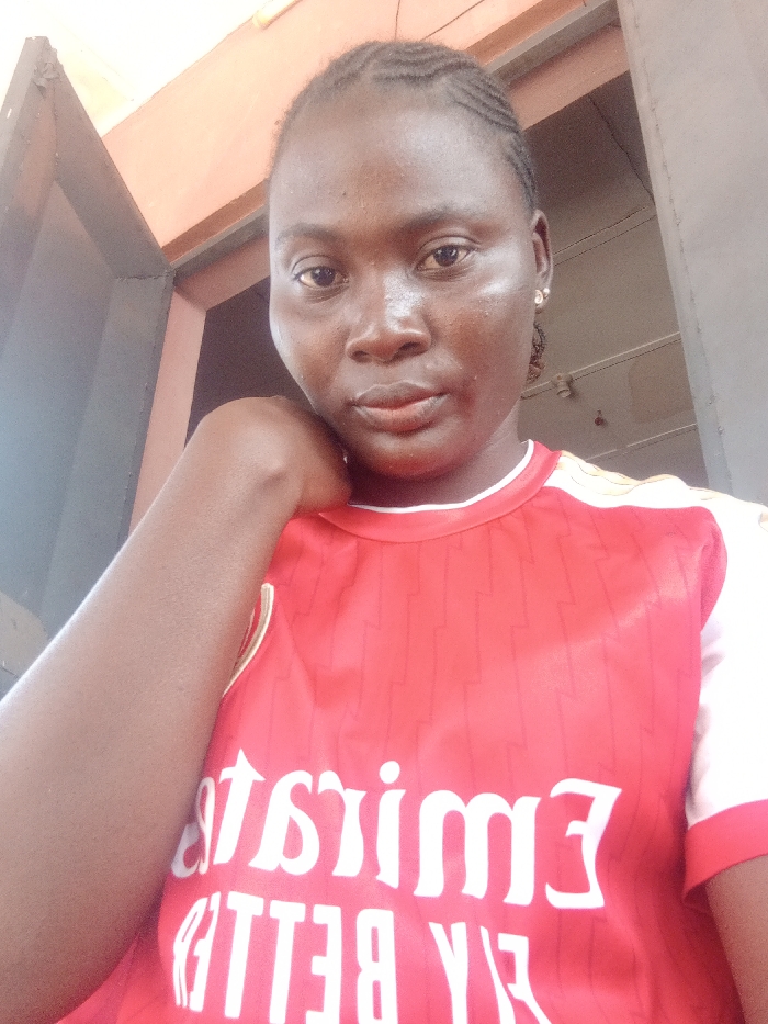 An adult female subject is depicted in a medium-close-up image, looking directly at the camera with a neutral expression. She has dark skin and her hair is styled in cornrows. She wears a red and white short-sleeved jersey with the text "Emirates FLY BETTER" prominently displayed in white, reversed, across the chest, indicating a selfie or mirror image. A small, light-colored stud earring is visible in her left earlobe. Her right arm is bent, with her hand or forearm resting against the side of her face/chin. The background appears to be an interior or semi-enclosed space, featuring a dark angled frame on the left, an orange-brown structure at the top, and a darker vertical element on the right. The scene is located in the city of Akwanga, Nigeria.