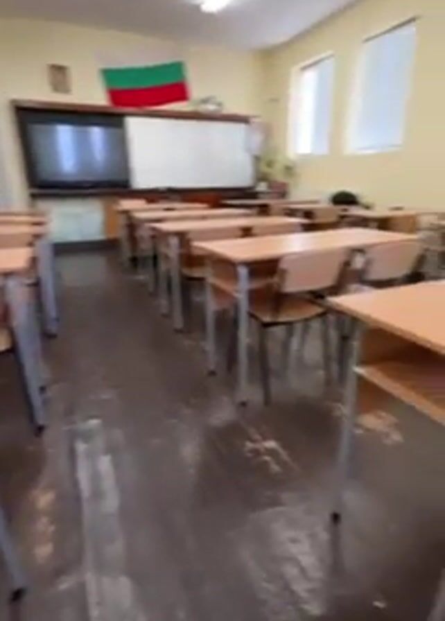 n empty classroom. There are rows of desks and chairs. A whiteboard and interactive display board are mounted to the wall. The flag of Bulgaria is also displayed. The floor is dark wood. The walls are pale yellow. There is a bookshelf against the left wall. A door is also visible near the bookshelf.