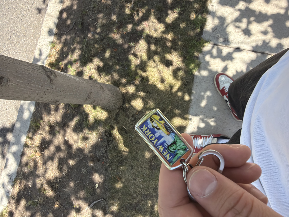 A hand holds a New York keychain in front of a tree and grass. Shadows of leaves and branches cover the ground. A person is wearing red and white sneakers, dark jeans, and a white shirt. The scene appears to be outdoors on a sunny day.