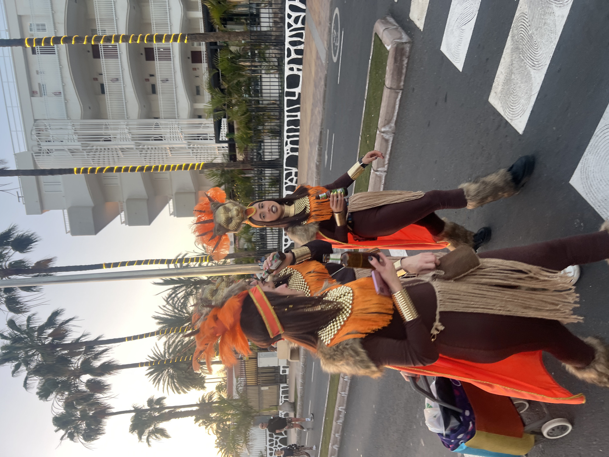 Two women in costumes are walking on a crosswalk in San Bartolomé de Tirajana, Spain. The women are wearing brown and orange costumes with feathered headdresses and fur accents. One woman is holding a beverage and the other a cell phone. A stroller is being pushed by the woman using a cell phone. The background includes buildings, palm trees adorned with lights, and a fence. The sky is visible in the upper portion of the frame.
