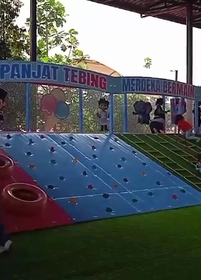 group of children playing in a playground with various activities. The playground has a colorful structure with climbing walls, slides, and a rope ladder. The structure is labeled with the words "OBANG RINTANG," "PANJAT TEBING," "MERDEKA BERMAIN," and "RAINBOW SLIDE." Some children are climbing, sliding, or walking around on the artificial grass. In the background, there is a building with a red dome. The playground is covered by a metal roof.