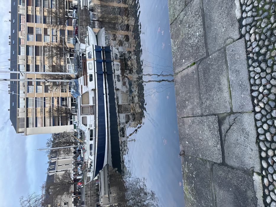 The image presents a forensic view of the Bassin Saint-Pierre in Caen, France, specifically looking towards the Quai de Vendeuvre and Quai de Juillet, under an overcast sky. In the immediate foreground, a promenade constructed from large, irregularly shaped grey flagstones meets the water's edge, with a metal mooring ring embedded near the water. Below the flagstones, a decorative border of smooth, light-grey rounded cobblestones is visible. Small patches of green moss adhere to cracks in the stone. The tranquil water of the basin reflects the sky and surrounding structures, with several fallen brown leaves floating on its surface. The primary subject is a blue-hulled motor sailboat or pilothouse cruiser with a white superstructure, moored in the midground. It features a single mast, visible rigging, several windows, and three blue fenders hanging along its starboard side. A letter "A" is visible on the bow. To the left of this vessel, a smaller, white dinghy is moored, and further right, the bow section of another white sailboat is partially visible. The opposite bank, which constitutes the background, features bare-branched trees lining a street where several vehicles, including a red car and a dark-colored car, are parked. Buildings dominate the horizon: on the left, a light-colored edifice with a partial "Mercure" sign visible, and to the center-right, a multi-story residential building characterized by numerous balconies and light-colored facades beneath a dark, flat roof with small dormer windows. No human figures are distinctly visible.